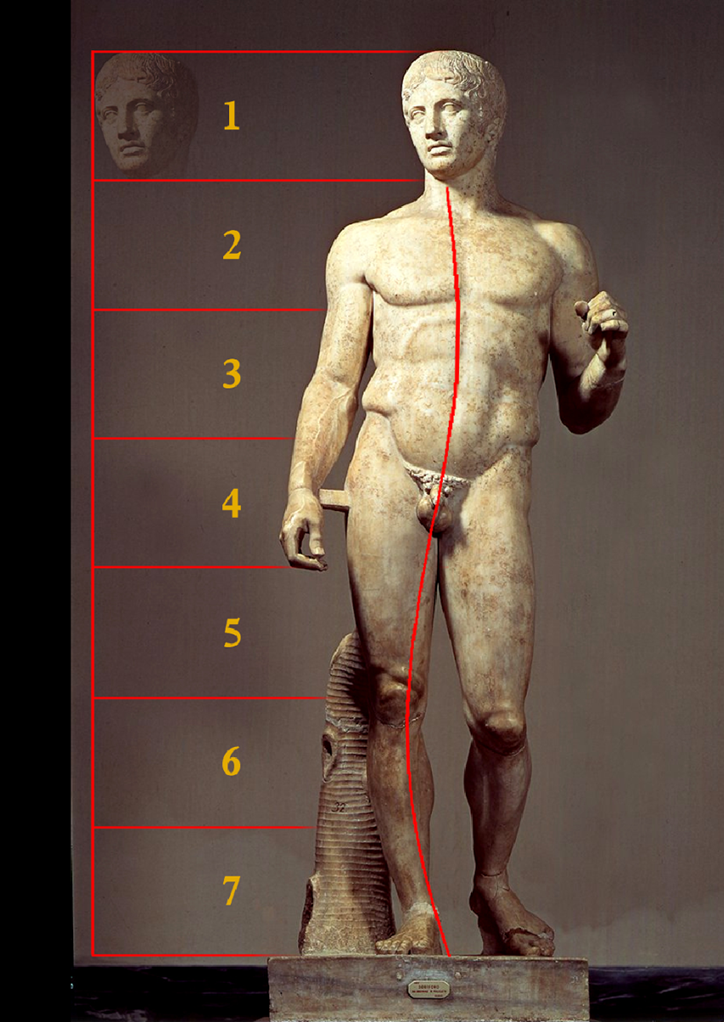 Canon de Policleto: proporción de 1:7 (cabeza/corpo).